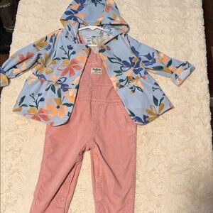 Colorful floral hooded jacket. Paired with soft pink overalls. Top is by Carters size 24 months.