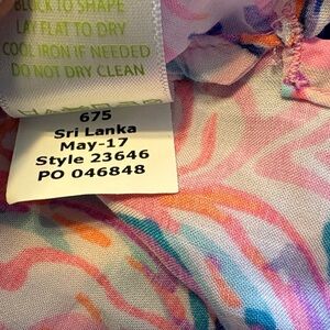 Chic blouse with a pink and blue swirl design. Lightweight and stylish. Perfect for any occasion.
