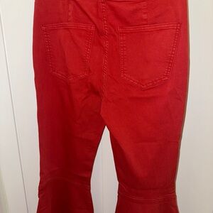 Stylish and vibrant red flared jeans perfect for any occasion. Add a pop of color to your wardrobe with these comfortable and trendy jeans. Good amount of soft stretch. High rise.