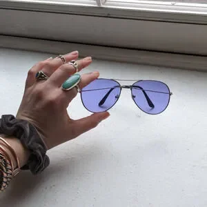 Love these gorgeous aviator shades. 70s almost famous does 90s baddie chic vibes. Very groovy retro color pop. Lightweight silver metal aviator style frame, unique pastel purple colored lenses. Super chic, tint is light enough to be worn inside and at night. Minimal clean look, comfortable plastic padded metal nose pieces. Lenses are clean, hardware is tight. New old stock / deadstock NWOT