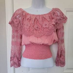 Joanie Fashion Pink Lace Smocked Bodice Blouse Fairy Coquette Girly Size Medium