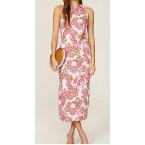 This is a beautiful Summer Midi Dress from SUBOO. It has a bright paisley print with a 4” slit and a cool cut-out with bead detailing. Material and details... Pink floral cotton (100% Cotton), Sheath style, Crew neck, Sleeveless and Back zipper closure. Colors are purples, orange and green.