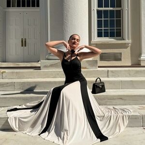Stunning black and white evening dress with a flowing design. Perfect for formal occasions.