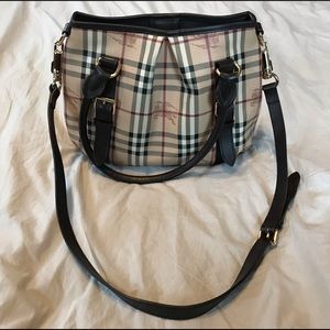 Slightly used. Excellent condition. Traditional Haymarket Check Coated canvas. One center zip compartment, one zip pocket, two flat pockets. Double rolled leather handles and long detachable shoulder strap