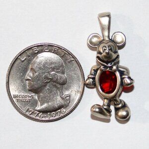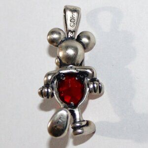 Disney Mickey Mouse pendant in sterling silver and set with red faceted glass. Bale is large enough to fit most chains or thinner cords.