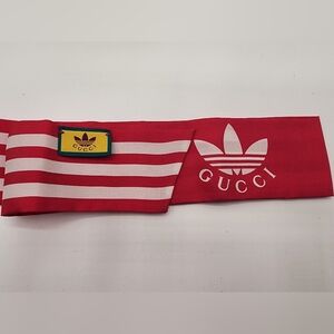 Stylish Gucci x Adidas scarf with red and white stripes. Features iconic logo.