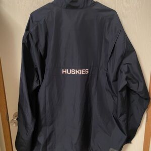 Navy windbreaker featuring UCONN logo. Lightweight and stylish. Ideal for casual wear.