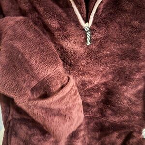 Cozy and stylish pullover. Soft fleece material. Thumb holes in sleeves for warm hands. Quarter zip. Perfect for chilly days.