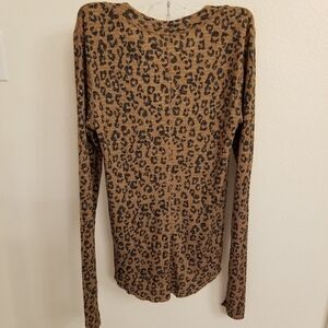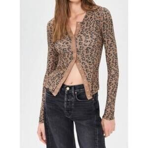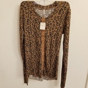 NEW FREE PEOPLE going places printed cardigan in Animal Print. Snaps are rose gold. Size XL. Stretch. Soft. Princess seams in front make it form fitting on the body. Fishtail cut in the back. Top is the perfect edgy-meets-flattering staple. It features front princess seams that expertly contour to your figure, creating a slim, elongated silhouette that highlights your curves without bunching. The opaque, stretchy animal print fabric ensures a secure fit, while the subtle fishtail hem provides confident, modest coverage in the back. A truly curve-hugging 'going out' top that stays in place all night!