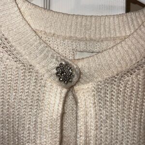Chic cream cardigan with a unique jewel button. Perfect for layering and versatile styling.