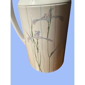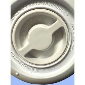The Vintage CORNING SHADOW IRIS THERMIQUE 1 Qt Carafe & Lid is a stylish and retro addition to any kitchen. Made of durable plastic with a glossy white finish, this pitcher features a unique shadow iris design that adds a touch of charm to your home. The 1980s style and insulated features make it perfect for serving coffee or tea at all occasions. This set includes the lid, handle for easy pouring, and a compartment for your favorite beverage. Hand wash only to preserve its vintage appeal.