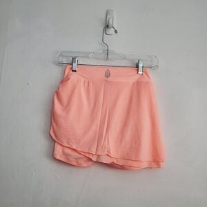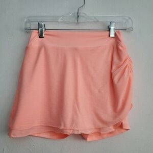 Made for moving through your favorite dance class, this feminine skort features a double-layered skirt over stretchy shorts with ruched detailing and lettuce-edge trim.
