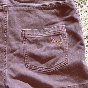 Stylish purple brown overall shorts perfect for casual outings. Comfortable and trendy design. Features adjustable straps, deep front pockets, and back pockets with embroidered detail.