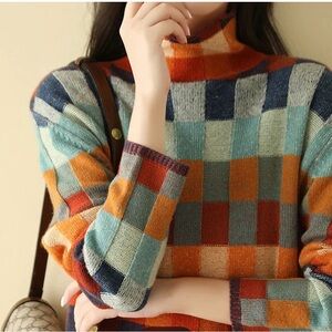 Embrace warmth and style with this vibrant checkered turtleneck sweater. Featuring a stunning array of colors, it's perfect for any fashion-forward wardrobe.