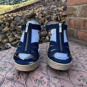 Michael Kors 9M Berkley Wedge Espadrille Canvas Sandals Navy Blue Zipper
