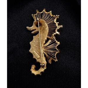 This striking seahorse brooch reflects the bold yet refined costume jewelry aesthetic of the 1960s, a decade when American fashion embraced sculptural forms and statement accessories.