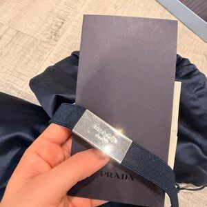 Stylish black combat boots with chunky soles. Features iconic Prada logo. Perfect for edgy fashion.
