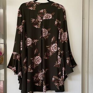 Chic boho style dress with a floral pattern. Flowing bell sleeves add elegance. Ideal for day or night. Beautiful with boots or sandals
