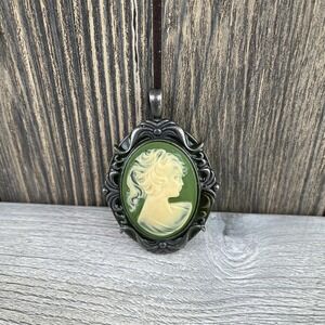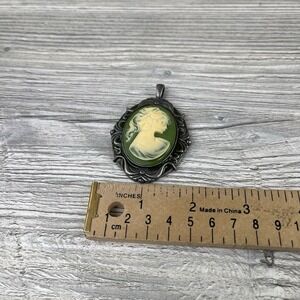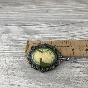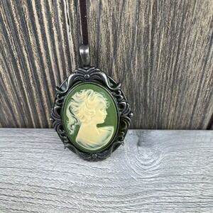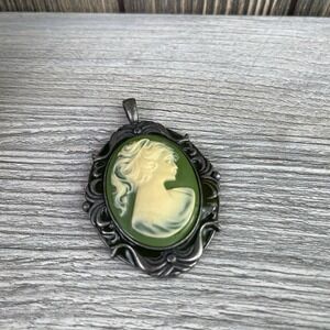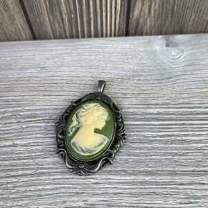 Vintage Silver Tone Green Carved Victorian Cameo Pendant 2.3"