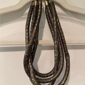 This elegant multi-strand necklace features a stunning blend of black and gold tones, perfect for adding a touch of sophistication to any outfit.