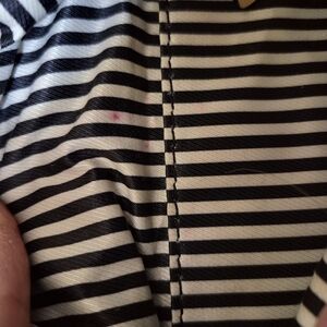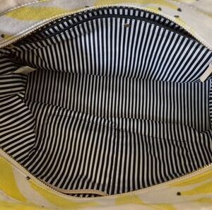 Kate Spade New York That's Bananas Francis tote is crafted from durable poplin canvas with smooth cowhide leather trim and features a top zip closure. Bag measures approximately 14" x 10" x 5.5". Callouts are a few interior red ink stains, corner wear, and wear on bottom of bag. Please see all photos.