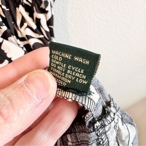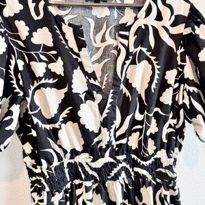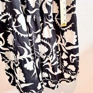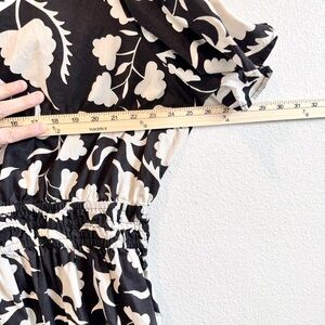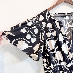 Statement black and ivory botanical print in an effortless boho silhouette. This Meadow Rhodes dress features a flattering V-neckline, flowy flutter sleeves, smocked elastic waist, and tiered midi skirt for movement and comfort. Lightweight cotton makes it breathable and perfect for year-round styling.