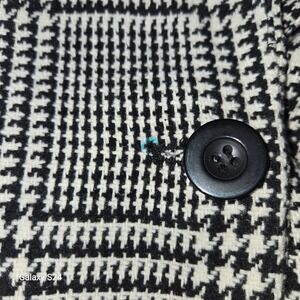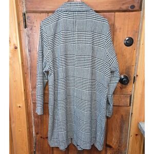 A versatile black and white houndstooth plaid blazer coatigan jacket. This piece offers a stylish layered look with a classic lapel and single button closure. Its longline silhouette makes it suitable for both casual outings and professional settings.