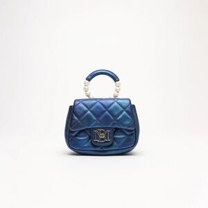 This stylish blue quilted handbag features a unique pearl handle and a sleek chain strap. Perfect for adding a touch of elegance to any outfit.
