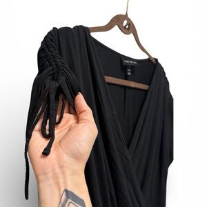 Features a surplice V-neckline, elastic waist for shape, and adjustable ruched sleeves with tie detail. Soft, stretchy fabric that drapes beautifully while giving you the comfort of shorts underneath.