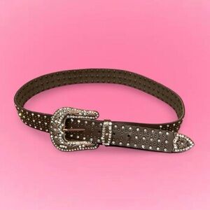 Stylish brown genuine leather belt with rhinestones.Featuring a detailed silver buckle. Perfect for enhancing any outfit.