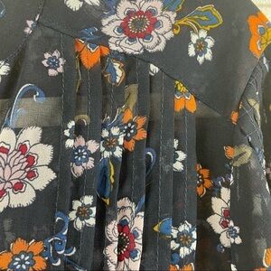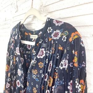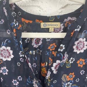 Democracy Blue Floral Sheer V-Neck Gathered Hi-Lo Bohemian Drapey Top Size Small