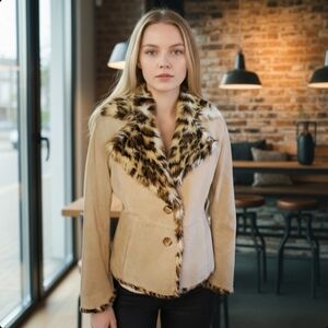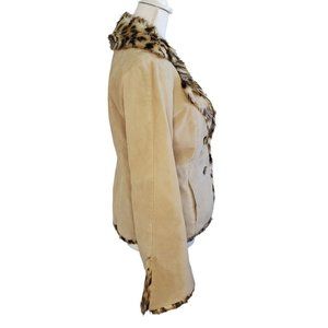 90s Y2K Suede Leather Jacket Faux Fur Leopard Collar Beige Penny Lane Sz Small