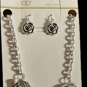SILVER TONE ROSE FLOWER NECKLACE W/EARRINGS (NWT)
