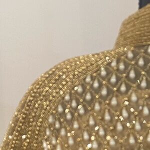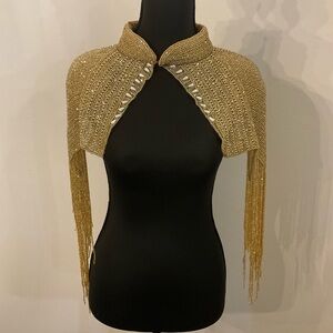 Elegant gold beaded cape with fringe detailing. Perfect for adding a touch of glamour.