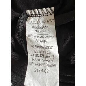 Scandal Italy wide leg palazzo pants feature a vibrant bohemian tile and floral print 100% silk overlay. Designed with a comfortable wide black elasticized waistband, these pants offer a flowy, layered silhouette with a solid black lining. The lightweight silk, and viscose blend fabric under layer provides a luxurious feel and elegant drape, perfect for resort wear or casual chic styling. One size. Excellent condition.