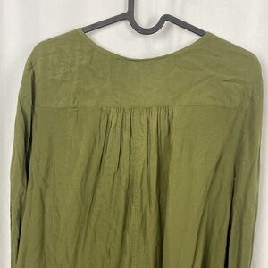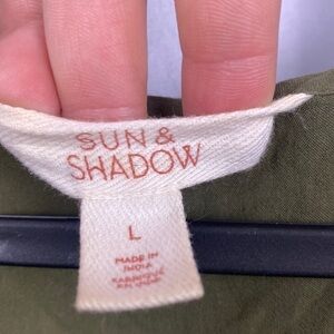 Introducing the Sun & Shadow Olive Green Button Front Lace Ribbon Accent Blouse in size Large – a stylish and feminine addition to your wardrobe!