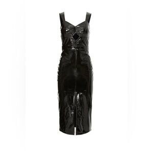 Black vegan leather (100% Polyurethane with 100% Polyester backing). Lining (96% Polyester, 4% Spandex). Sheath. Sleeveless. Sweetheart. Back zipper closure. 43.5" from shoulder to hemline. 14.5" slit.