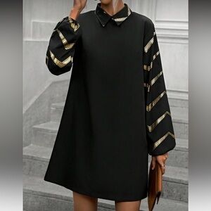 Elegant black dress with striking gold accents. Perfect for any occasion.
