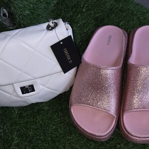 combo Forever 21 sandals and crossbody Stylish pink glitter slides paired with a chic white quilted bag. Perfect for a trendy look. Take both for an incredible price sandals size 9