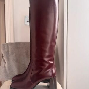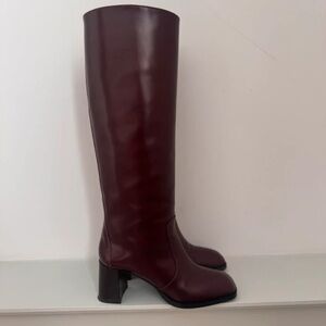 Elegant Prada boots in deep burgundy. Ideal for chic ensembles.
