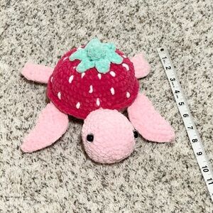 Adorable strawberry-themed turtle plush. Features a red shell with green and pink accents.