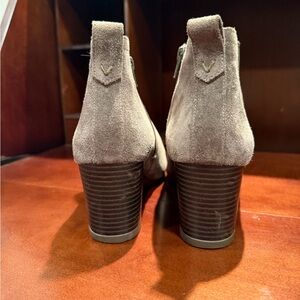Chic suede ankle boots by Vionic. Soft taupe color. Ideal for versatile styling.