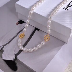 Elegant necklace featuring white pearls and gold emblems. Perfect for a chic look.