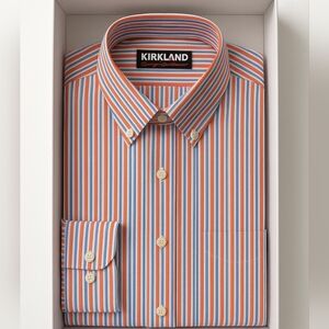Dress/casual shirt. Men's long sleeve button down shirt. Kirkland Signature size 17-33 orange white blue stripes. Like new. Measurements are approximate measurements sleeves from shoulder seam to hem of sleeve