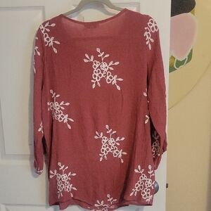 Elevate your wardrobe with this chic rose blouse featuring elegant white embroidery. Perfect for both casual and formal occasions. 24" pit to pit and 30" length A16. see fraying spot on neckline