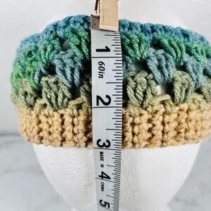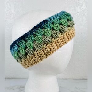 Stay cozy and stylish with this handcrafted crochet headband. Featuring a blend of green, blue, and tan hues, it's perfect for adding a pop of color to your outfit.