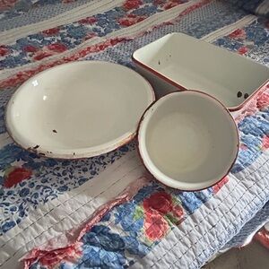 Enamelware White and Red Dish Set