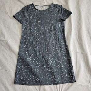 Chic blue dress with white speckles. Features short sleeves and a round neckline.