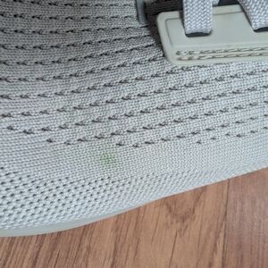 Stylish cream athletic running shoes. barefoot running style. they have been used a handful of times, mostly on a treadmill, but also for some errands. I really love the wide toe box and massaging sole, but I've just determined I need more support as I overpronate too much to jump right into barefoot shoes. They are very easily washable and have recently been washed before posting. there is one small grass stain as pictured that has not come out.