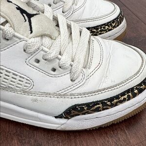 Authentic Jordan Spizike Low White Metallic Gold Shoes Sneakers in a size 6.5 Youth. Not an easy sneaker to find, white shoes with black and metallic gold animal print, lots of great details. Generalized visible wear, all shown accurately in photos.